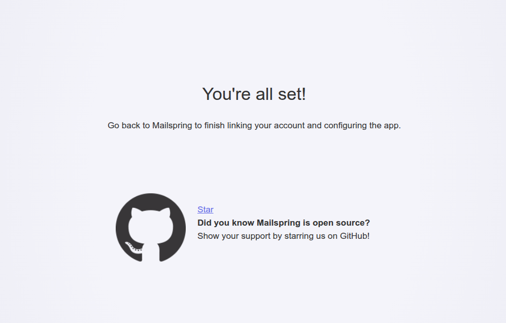 - After you log in the browser, you will get the screen “You’re all set”, but Mailspring with complain about IMAP authentication error.