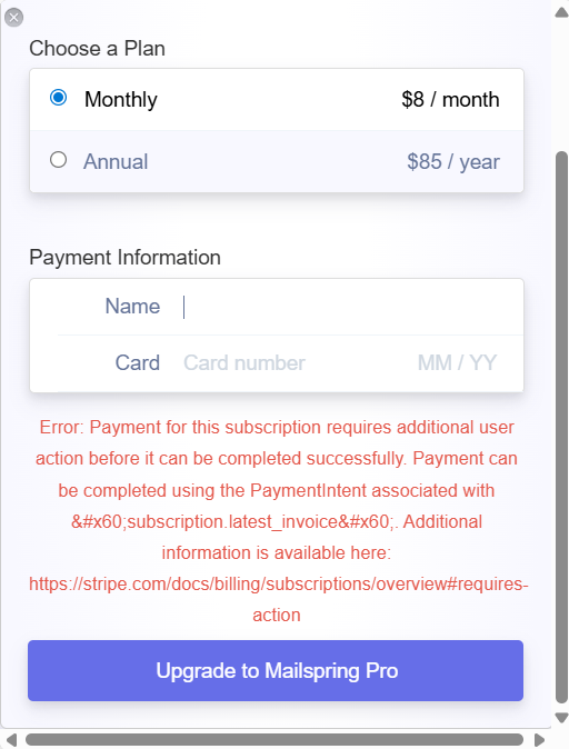 Thanks for reporting this – we upgraded our payment provider (Stripe) integration over the weekend and it now supports 3DSecure payment verification within the app and on the website. I believe you’ll see a modal appear with a security question / 2FA code prompt / bank login, and then it’ll succeed after you complete the prompt.