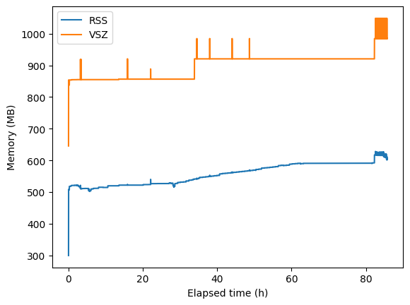 This has been the case for a while. I finally took the time to measure the memory usage. Here’s a plot of the resident memory (RSS) and virtual memory (VSZ) for one such process as reported by ps -o rss,vsz measured over 23 hours: