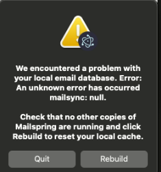Check that no other copies of Mailspring are running and click Rebuild to reset your local cache.